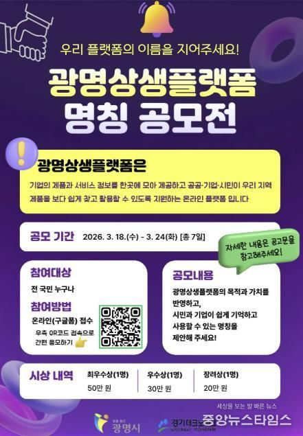 박승원 광명시장은 “이번 명칭 공모전은 광명상생플랫폼의 정체성을 시민과 함께 만들어가는 뜻깊은 과정”이라며 “참신한 아이디어를 바탕으로 지역 중소기업을 지원하고 지역경제 선순환에 기여하는 플랫폼으로 더욱 발전시켜 나가겠다”고 밝혔다.