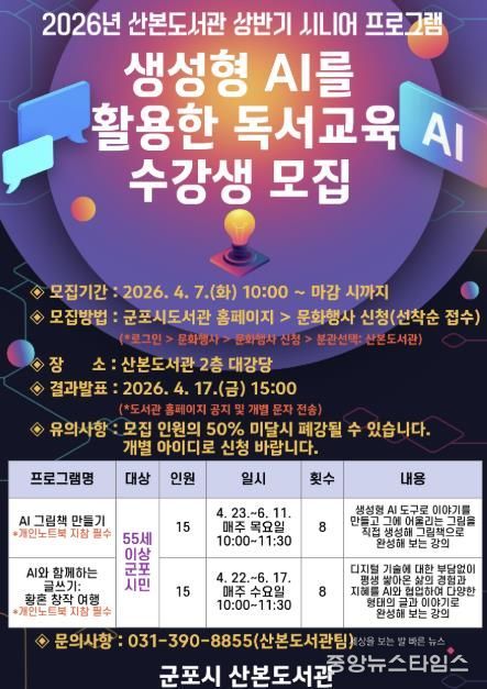모집 대상은 55세 이상 군포 시민이며 산본도서관 2층 대강당에서 각 프로그램마다 8회차로 진행된다. 신청은 2026년 4월 7일부터 군포시 도서관 누리집을 통해 선착순으로 접수하고 수강생 명단은 4월 17일 도서관 누리집에 공지된다.