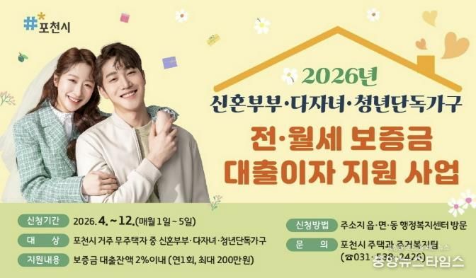 (중앙뉴스타임스 = 방재영 기자) 포천시는 ‘2026년 신혼부부·다자녀·청년가구 전월세 보증금 대출이자 지원사업’을 추진한다.