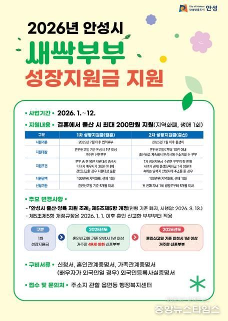 (중앙뉴스타임스 = 방재영 기자) 안성시는 3월 13일'안성시 출산·양육 지원 조례'일부개정을 통해 새싹부부성장지원금 연령 기준(49세이하 신혼부부)을 폐지하여 지원 대상을 확대했다.