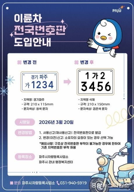 (중앙뉴스타임스 = 방재영 기자) 파주시는 오는 20일부터 이륜차 전국번호판 제도를 본격 시행한다.