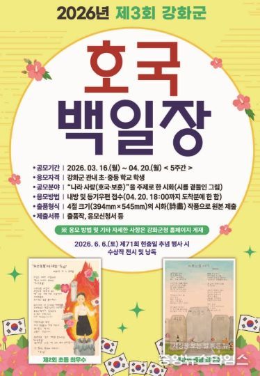 (중앙뉴스타임스 = 방재영 기자) 강화군은 오는 4월 20일까지 관내 초·중학교 학생들을 대상으로 ‘2026년 제3회 강화군 호국 백일장 공모전’을 개최한다고 밝혔다.