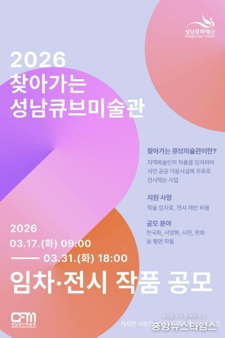 (중앙뉴스타임스 = 방재영 기자) 성남문화재단은 지역예술인의 창작 환경 지원을 다각화하고 시민들의 문화예술 향유기회를 확대하고자 ‘2026 찾아가는 성남큐브미술관’ 작품 임차 공모를 진행한다.