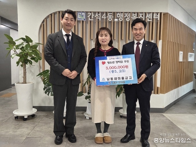 (중앙뉴스타임스 = 방재영 기자)인천 남동구 간석4동 행정복지센터는 최근 남동새마을금고로부터 저소득 가정 자녀 장학금 300만 원을 후원받았다고 19일 밝혔다.