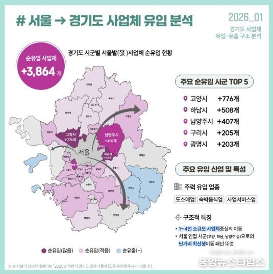 지난 1월 경기도일자리재단이 발표한 ‘경기도 사업체 유입·유출 구조 분석’에 따르면, 2022년부터 2025년까지 최근 3년간 서울에서 고양시로 순유입된 사업체 수는 총 776개로, 경기도 31개 시군 가운데 가장 많은 규모를 기록했다.