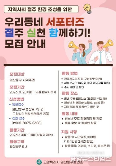 (중앙뉴스타임스 = 방재영 기자) 고양특례시 일산동구보건소는 건전한 음주문화 확산과 절주 실천 분위기 조성을 위한 ‘우리동네 서포터즈’의 참가자를 오는 3월 23일부터 모집한다.