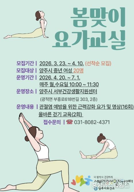 양주시 관계자는 "봄맞이 요가교실을 통해 여성들의 관절 운동 범위 회복과 강직 예방에 도움을 주고, 규칙적인 신체활동을 통해 지역 주민들의 건강한 생활습관을 형성하는 계기가 되길 바란다”고 말했다.
