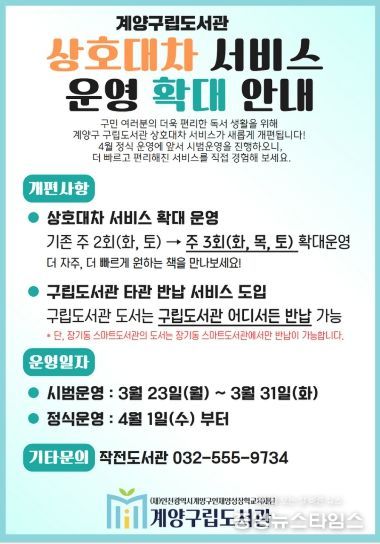 (중앙뉴스타임스 = 방재영 기자) (재)인천광역시계양구인재양성장학교육재단 계양구립도서관은 오는 4월 1일부터 상호대차 서비스 운영을 확대하고, 타관 반납 서비스를 새롭게 도입한다고 20일 밝혔다.