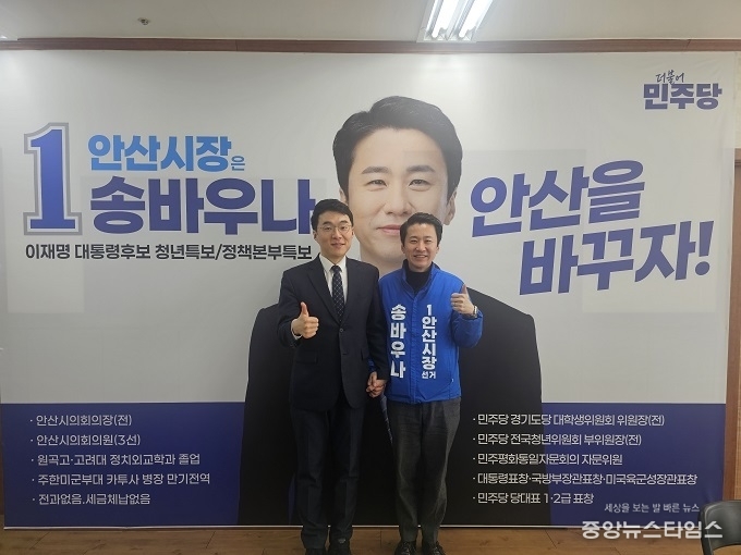 (중앙뉴스타임스 = 방재영 기자) 더불어민주당 김남국 대변인이 21일 송바우나 안산시장 예비후보 선거사무소를 방문해 응원의 메시지를 남겼다.