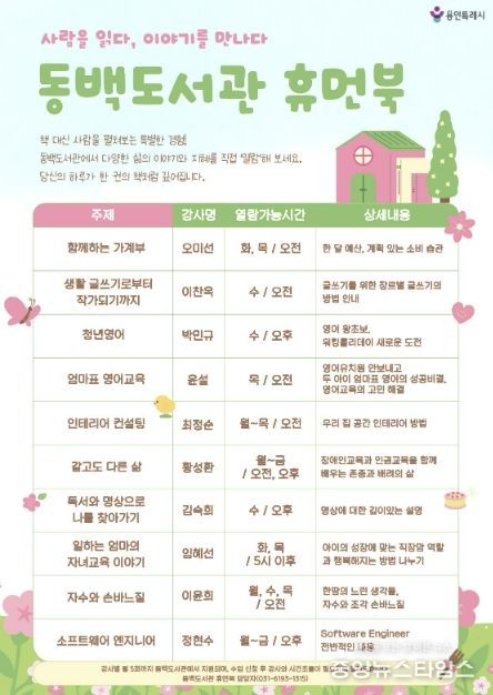 (중앙뉴스타임스 = 방재영 기자) 용인특례시 동백도서관은 오는 4월 1일부터 ‘휴먼북’ 프로그램을 정비해 본격 운영한다고 23일 밝혔다.