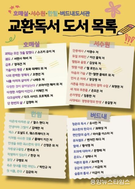 (중앙뉴스타임스 = 방재영 기자) 수원시 권선구 4개 공공도서관(호매실·서수원·한림·버드내도서관)이 책을 매개로 서로의 생각과 감상을 나누는 ‘교환독서 클럽’ 참여팀을 모집한다.