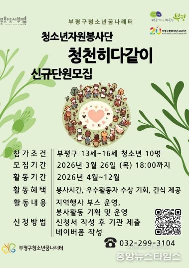 (중앙뉴스타임스 = 방재영 기자) 인천 부평구청소년꿈나래터는 오는 26일까지 2026년도 청소년자원봉사단 ‘청천히 다같이’ 단원을 신규 모집한다고 23일 밝혔다.