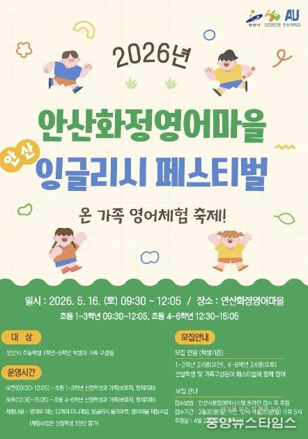 (중앙뉴스타임스 = 방재영 기자) 안산시가 설립하고 안산대학교가 운영하는 안산화정영어마을은 ‘온 가족 영어체험 축제!’를 주제로 ‘안산 잉글리시 페스티벌’을 운영한다고 24일 밝혔다.