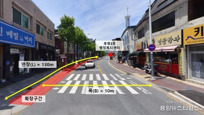 춘천시는 후평3동 행정복지센터~후평주공4단지 입구까지 사이 약 130m 구간의 기존 2차로를 3차로로 확장하는 공사를 추진한다.