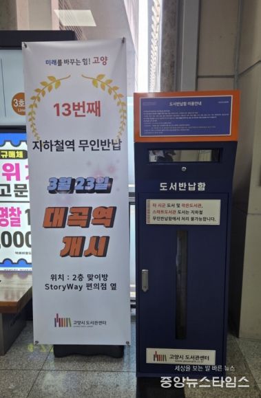 (중앙뉴스타임스 = 이광운 기자) 고양특례시 도서관센터는 시민들의 도서 반납 편의를 높이기 위해 대곡역에 무인도서반납함을 설치했다고 24일 밝혔다.