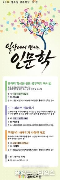 (중앙뉴스타임스 = 이광운 기자) 고양특례시 대화도서관의 대표 인문학 프로그램인 ‘열두달 인문학당’이 오는 4월부터 ‘일상에서 만나는 인문학’이라는 주제로 진행된다.