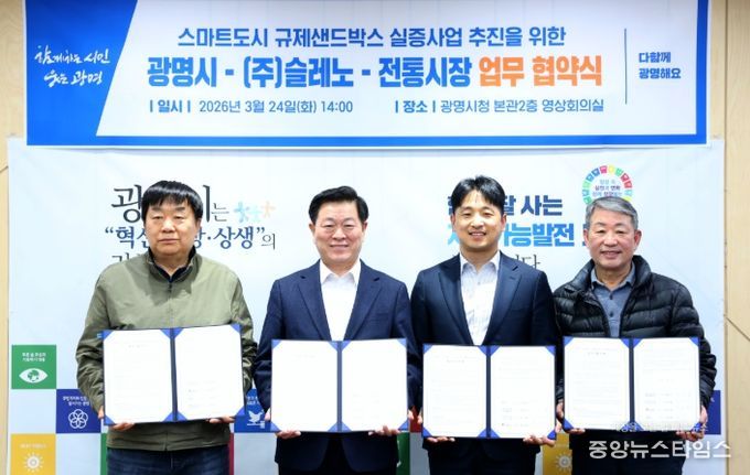 시는 24일 오후 시청 영상회의실에서 ‘스마트도시 규제샌드박스 실증사업’ 추진을 위해 사업 수행기관인 ㈜슬레노와 사업 대상지인 광명전통시장과 광명새마을시장의 4자 간 업무협약(MOU)을 체결했다.
