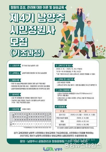 (중앙뉴스타임스 = 방재영 기자) 남양주시는 ‘제4기 남양주시민정원사 양성교육(기초과정)’ 참여자를 모집한다고 24일 밝혔다.