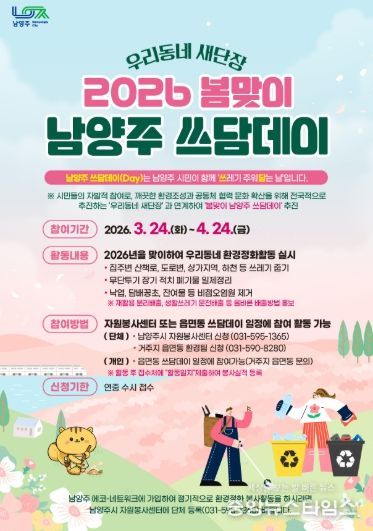 (중앙뉴스타임스 = 방재영 기자) 남양주시는 3월 24일부터 4월 24일까지 시 전역에서‘우리동네 새단장 봄맞이 남양주 쓰담데이’집중 추진기간을 운영한다고 밝혔다.