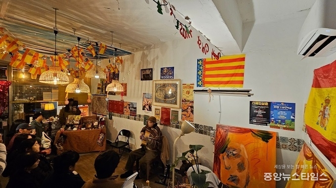 골목에 위치한 작은 가게에는 스페인 국기 가랜드와 FC바르셀로나 팀기, 각종 모임과 공연 포스터, 감각적인 유화작품들이 여기저기 걸려있다. 제멋대로인 듯 일종의 규칙과 문화를 품고 있는 공간을 보고 있노라면 주인장의 정체가 궁금해진다.