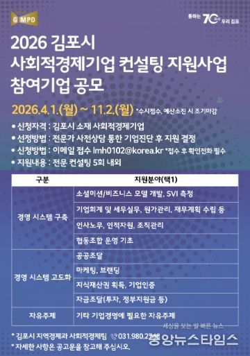 (중앙뉴스타임스 = 방재영 기자) 김포시가 관내 사회적경제기업의 지속 가능한 성장과 자생력 강화를 위해 ‘사회적경제기업 역량강화 컨설팅 지원사업’ 참여기업을 오는 11월까지 수시 모집한다.