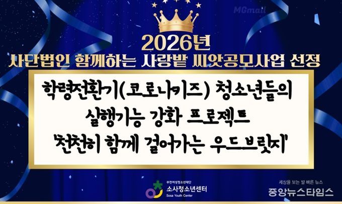 (중앙뉴스타임스 = 방재영 기자) 부천여성청소년재단이 운영하는 소사청소년센터가 사단법인 함께하는 사랑밭 주관 ‘2026년 함께하는 사랑밭 [씨앗공모사업]’ 기획공모 분야에 ‘학령전환기(코로나키즈) 청소년들의 실행기능 강화 프로젝트-천천히 함께 걸어가는 우드브릿지’ 프로그램이 선정됐다.