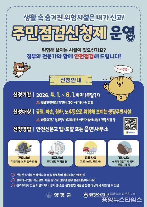 (중앙뉴스타임스 = 방재영 기자) 양평군은 군민의 눈높이에서 지역 사회의 안전 사각지대를 해소하기 위해 ‘2026년 집중안전점검 주민점검신청제’를 본격 운영한다고 밝혔다.