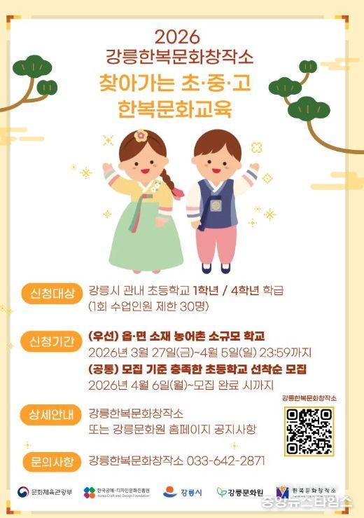(중앙뉴스타임스 = 방재영 기자) 강릉한복문화창작소는 2026 찾아가는 초중고 한복문화 교육에 참여할 초등학교를 모집한다고 1일 밝혔다.