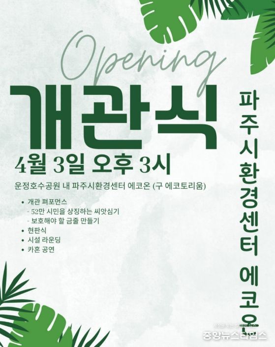 (중앙뉴스타임스 = 방재영 기자) 파주시는 오는 4월 3일 운정호수공원 내 에코토리움에서 '파주시환경센터 에코온' 개관식을 열 예정이다.