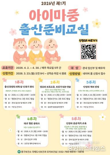 (중앙뉴스타임스 = 방재영 기자) 인천시 중구는 관내 임산부와 배우자를 대상으로 건강한 출산과 안정적인 육아 준비를 돕기 위한 ‘2026년 제1기 아이마중 출산준비교실’을 운영한다.