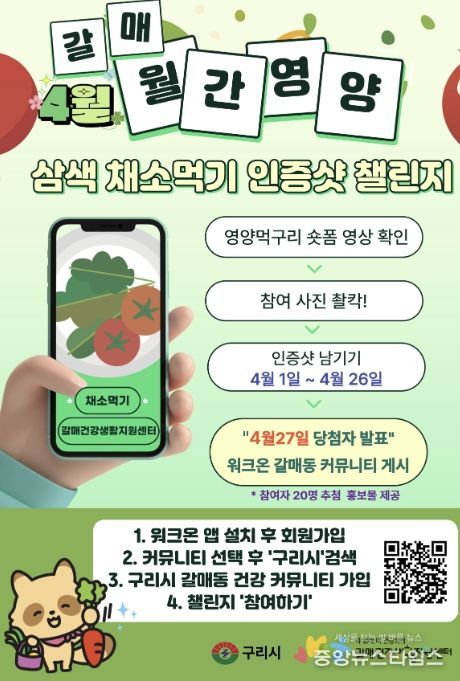 (중앙뉴스타임스 = 방재영 기자) 구리시 갈매건강생활지원센터는 오는 4월 1일부터 26일까지 주민 주도형 식습관 개선 사업인 ‘나를 위한 건강미션 - 갈매 월간영양’의 두 번째 프로그램으로 ‘내 식탁 위 무지개를 찾아라! 삼색 채소 먹기 인증사진 챌린지’를 운영한다고 밝혔다.