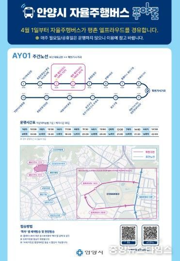 운행 노선도 일부 연장됐다. ‘주야로’는 평촌엘프라우드 아파트를 새롭게 경유해 1단지와 2단지에 각각 정차한다. 상행선(비산체육공원→학원가사거리 방면)은 종합운동장수영장.비산동교회 정류장을 거쳐 평촌엘프라우드 아파트 1, 2단지에 각각 추가 정차한다. 반면 하행선(학원가사거리→비산동 종점)은 기존과 동일하게 해당 아파트를 경유하지 않는다.