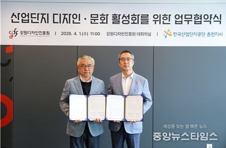 (중앙뉴스타임스 = 방재영 기자) 강원디자인진흥원은 1일 강원디자인진흥원 대회의실에서 한국산업단지공단 강원지역본부 춘천지사와 산업단지 내 디자인·문화 활성화를 위한 공동사업 추진 업무협약을 체결했다고 밝혔다.