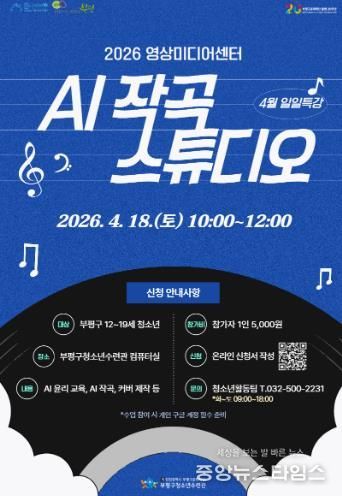(중앙뉴스타임스 = 방재영 기자) 부평구청소년수련관은 오는 18일 오전 10시 수련관에서 인공지능(AI)을 활용해 자신만의 디지털 앨범을 만들어보는 ‘AI 작곡 스튜디오’를 운영한다.