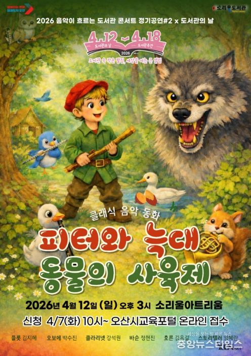 (중앙뉴스타임스 = 이광운 기자) 오산시 소리울도서관은 오는 4월 12일 오후 3시 소리울아트리움에서 ‘2026 도서관의 날’을 기념해 온 가족이 클래식의 매력을 즐길 수 있는 '음악이 흐르는 도서관 콘서트'를 개최한다.