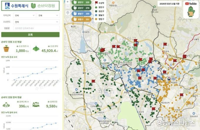 2024년에는 곳곳에 조성한 새빛수원 손바닥정원의 정보를 한눈에 볼 수 있는 온라인 지도 ‘지도로 보는 손바닥정원’을 구축했다. 손바닥정원 위치가 수원시 지도 위에 점으로 표시돼 있다.