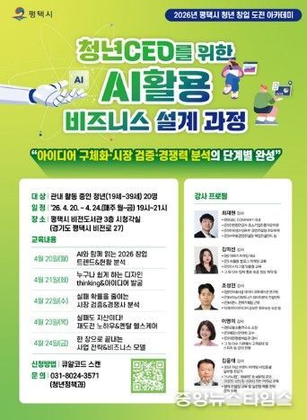 (중앙뉴스타임스 = 방재영 기자) 평택시는 오는 20일부터 24일까지(주5일, 19~21시) 평택시 비전도서관 시청각실에서 ‘청년 창업 도전 아카데미’ 강좌를 개설하고, 참여자 20명을 모집한다고 밝혔다.