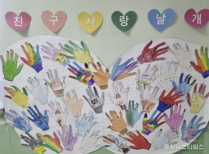 또한 학생들은 학급별로 ‘친구사랑 5계명’을 만들고 함께 선서하며 학교폭력 없는 학교를 만들 것을 다짐했다. 친구에게 감사의 마음을 담은 카드와 선물을 전달하는 활동을 비롯해 편지쓰기, 친구 캐릭터 그리기, 친구 이름으로 삼행시 짓기 등 다양한 친구사랑 프로그램도 함께 운영됐다.