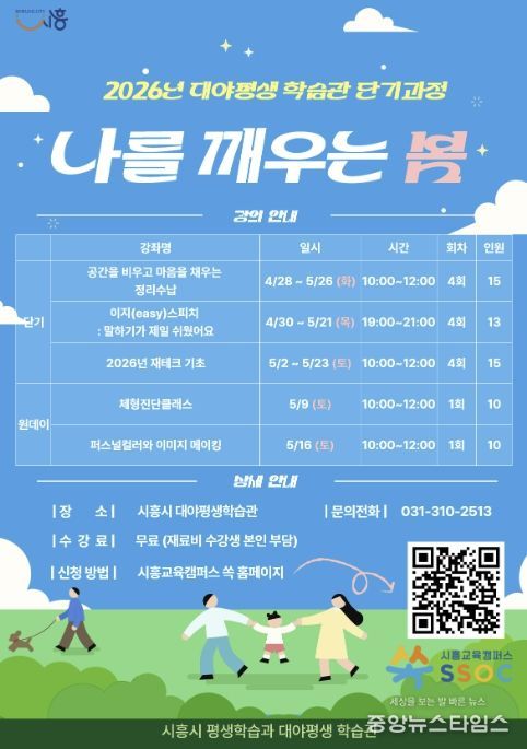(중앙뉴스타임스 = 방재영 기자) 시흥시 대야평생학습관은 6일부터 ‘나를 깨우는 봄’을 주제로 한 2026년 단기과정 및 원데이 클래스 평생학습 프로그램 수강생 모집을 시작한다고 밝혔다.