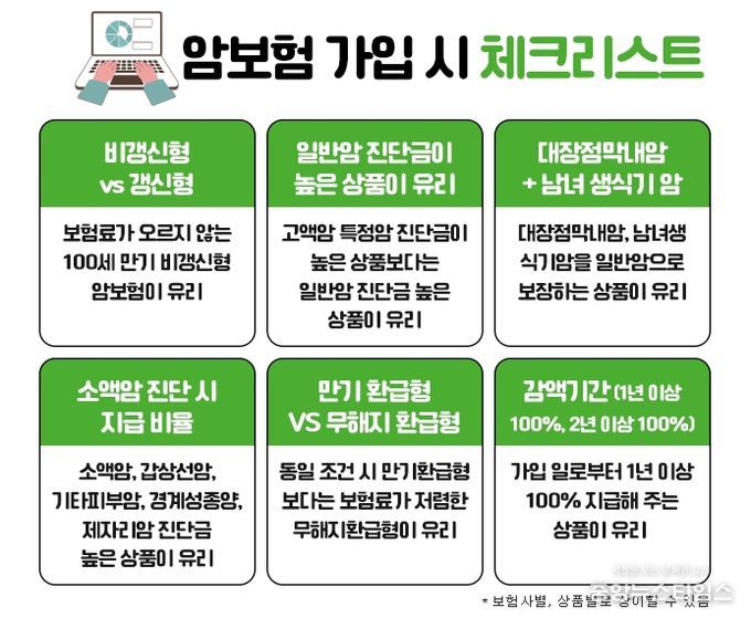 우선, 암보험을 가입하기 위해서는 갱신형 상품과 비갱신형 상품중에서 선택을 해야 한다. 갱신형은 처음 가입 시에는 보험료가 상대적으로 저렴하지만 갱신을 이어가면서 보험료가 계속 인상될 수 있고, 비갱신형은 초기 보험료는 갱신형보다 높을 수 있지만, 가입 후에 보험료인상이 없어 안정적으로 유지관리가 가능한 장점이 있다. 따라서 이러한 장단점을 고려하여 본인의 상황에 맞게 선택하는 것이 좋다.