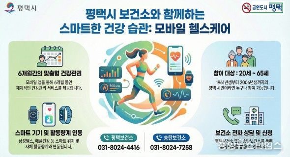 (중앙뉴스타임스 = 방재영 기자) 평택시가 시민들의 만성질환 예방과 건강한 생활 습관 형성을 돕기 위해 ‘2026년 보건소 모바일 헬스케어’ 사업을 시작하고 참여자를 선착순 모집하고 있다.