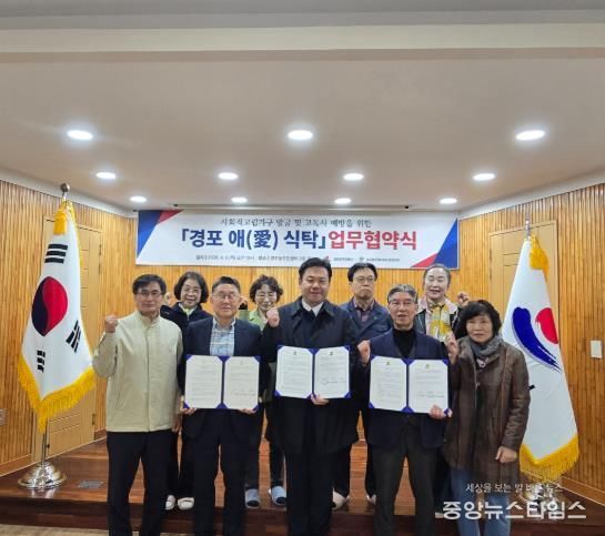 (중앙뉴스타임스 = 방재영 기자) 강릉시 경포동 주민센터는 9일 경포동 지역사회보장협의체, 우리집맛찬과 함께 사회적 고립가구 발굴 및 고독사 예방 사업 운영을 위한 ‘경포 애(愛) 식탁’ 협약을 체결했다.