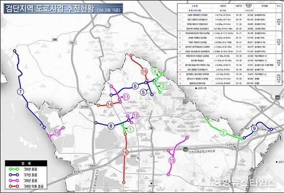 첫째, 검단지역에서는 검단양촌IC~봉수대로, 금곡동~대곡동 구간 등 총 16개 도로사업이 추진된다. 총연장 40.73km, 사업비는 약 1조 6,137억 원에 달한다.