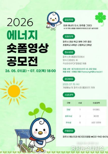 (중앙뉴스타임스 = 방재영 기자) 파주시는 청소년들의 에너지 인식을 제고하고 디지털 미디어 활용 역량을 강화하기 위해 녪년 파주시 청소년 에너지 숏폼 영상 공모전’을 개최한다.