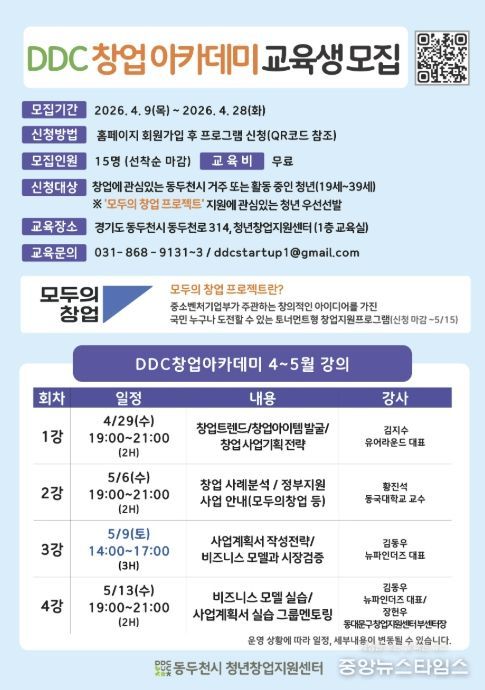 (중앙뉴스타임스 = 방재영 기자) 동두천시 청년창업지원센터는 지역 청년들의 창업 역량 강화와 성공적인 창업 지원을 위해 4월 9일부터 4월 28일까지 ‘DDC 창업아카데미’ 교육생을 모집한다.