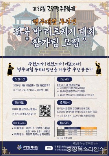 (중앙뉴스타임스 = 이광운 기자) 고양문화재단은 오는 6월 열릴 고양행주문화제의 대표 프로그램 중 하나인 행주대첩 투석전 ‘전국 박 터트리기 대회’의 참가팀을 오는 5월 8일까지 모집한다.
