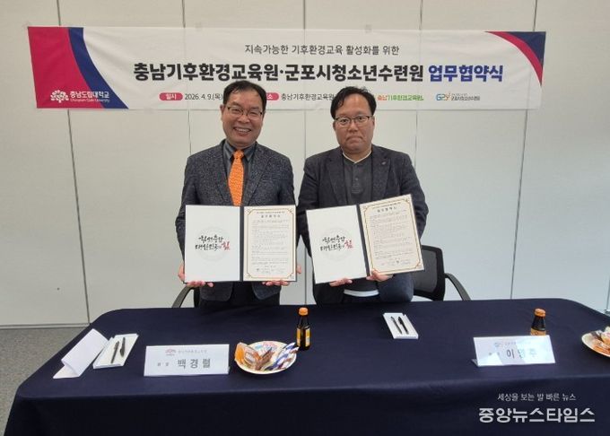 (중앙뉴스타임스 = 방재영 기자) (재)군포시청소년재단이 운영하는 군포시청소년수련원(충남 청양)과 충남기후환경교육원(충남 청양)은 4월 9일, 미래세대의 지속가능 기후환경교육 활성화를 위한 업무협약을 체결했다고 전했다.