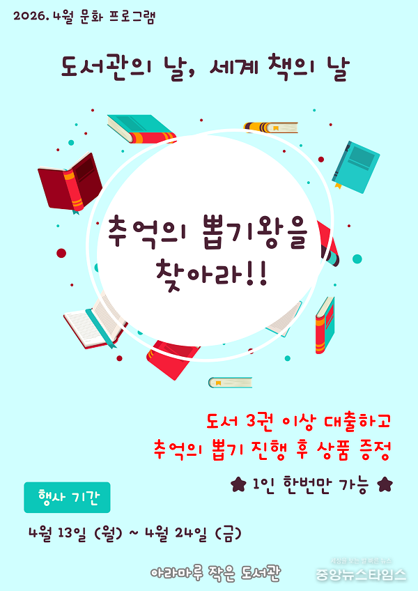 행사 기간 중 아라마루 작은 도서관을 방문해 도서를 3권 이상 대출하는 이용자라면 누구나 참여할 수 있다. 참여 방법은 도서 대출 후 도서관 내 비치된 ‘추억의 뽑기 판’에서 등수별 상품을 뽑는 방식으로 진행되며, 1인당 1회 참여할 수 있다.