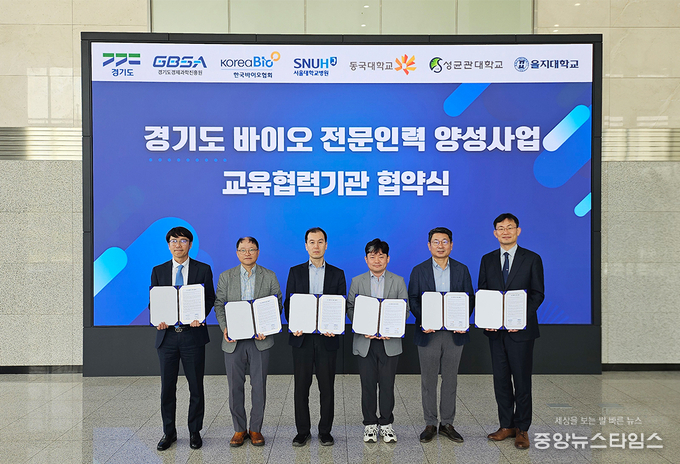 협약식에는 최해종 경과원 바이오산업본부장, 손지호 한국바이오협회 본부장, 김세중 분당서울대병원 센터장, 조재열 성균관대 생명공학대학 학장(교수), 이광근 동국대(일산) 교수, 김인식 을지대(의정부) 산학협력단장 등 관계자 20여 명이 참석했다.