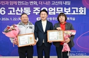 (중앙뉴스타임스 = 방재영 기자) 의정부시 고산동주민센터는 22일 주민센터 2층 다목적실에서 ‘2026년 주요업무보고회’를 개최했다. 이번 보고회는 ‘주민과 함께 만드는 변화, 더 나은 고산의 내일’을 주제로 지역 주민과 내빈 등 100여 명이 참석한 가운데 2025년 추진 경과 및 2026년 중점 추진 사업을 주민과 함께 공유하기 위해 마련됐다. 행사는 주민자치센터 수강생의 식전공연을 시작으로 ▲새해 인사 및 덕담 ▲지역발전 유공자 표창장 수여 ▲주요 업무 보고 ▲주민과의 대화 순으로 진행됐다. 고산동장은 주요업무 보고를 통해 ▲고산동 신설 ▲물류센터 부지 공공주택 공급 전환 ▲대형유통시설 입접 관련 협약 ▲아이돌봄시설 클러스터 시범사업 ▲학생 통학버스, 똑버스 등 대중교통 개선 및 나눔주차장 조성을 통한 교통환경 개선 등 생활밀착형 사업의 추진 경과를 공유했다. 또, ▲디자인도서관 조성 ▲민락TG 우회도로 개설 ▲법조타운 조성 ▲고산지구 제3공영주차장 조성 ▲주민커뮤니티 공간 조성 ▲민관협력, 모두가 돌보는 온(on)마을 공동체 사업 등 2026년 진행 예정인 핵심 사업을 설명하며 주민과 함께 고산동의 미래가치를 더욱 높여 나가겠다고 설명했다. 이어진 ‘